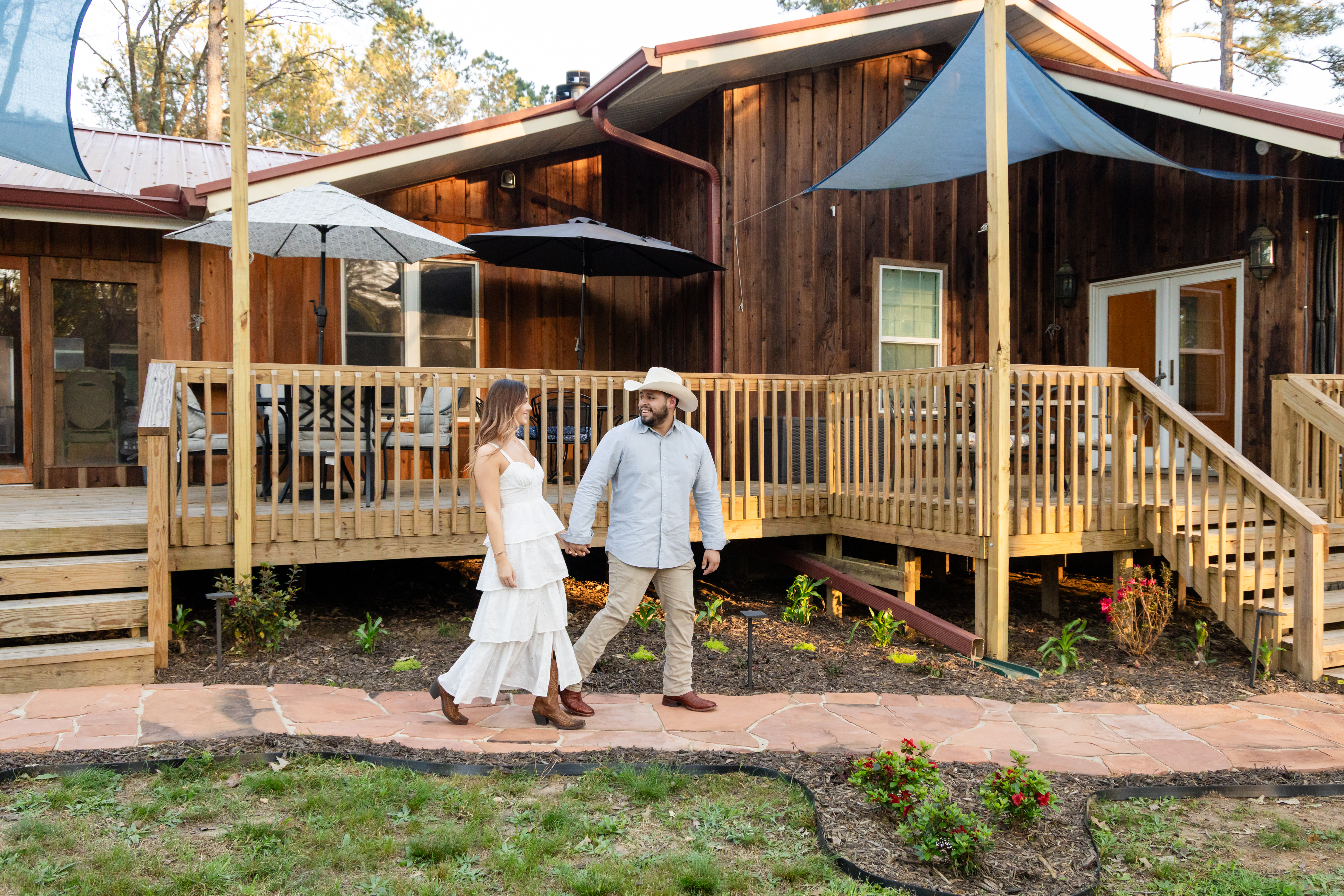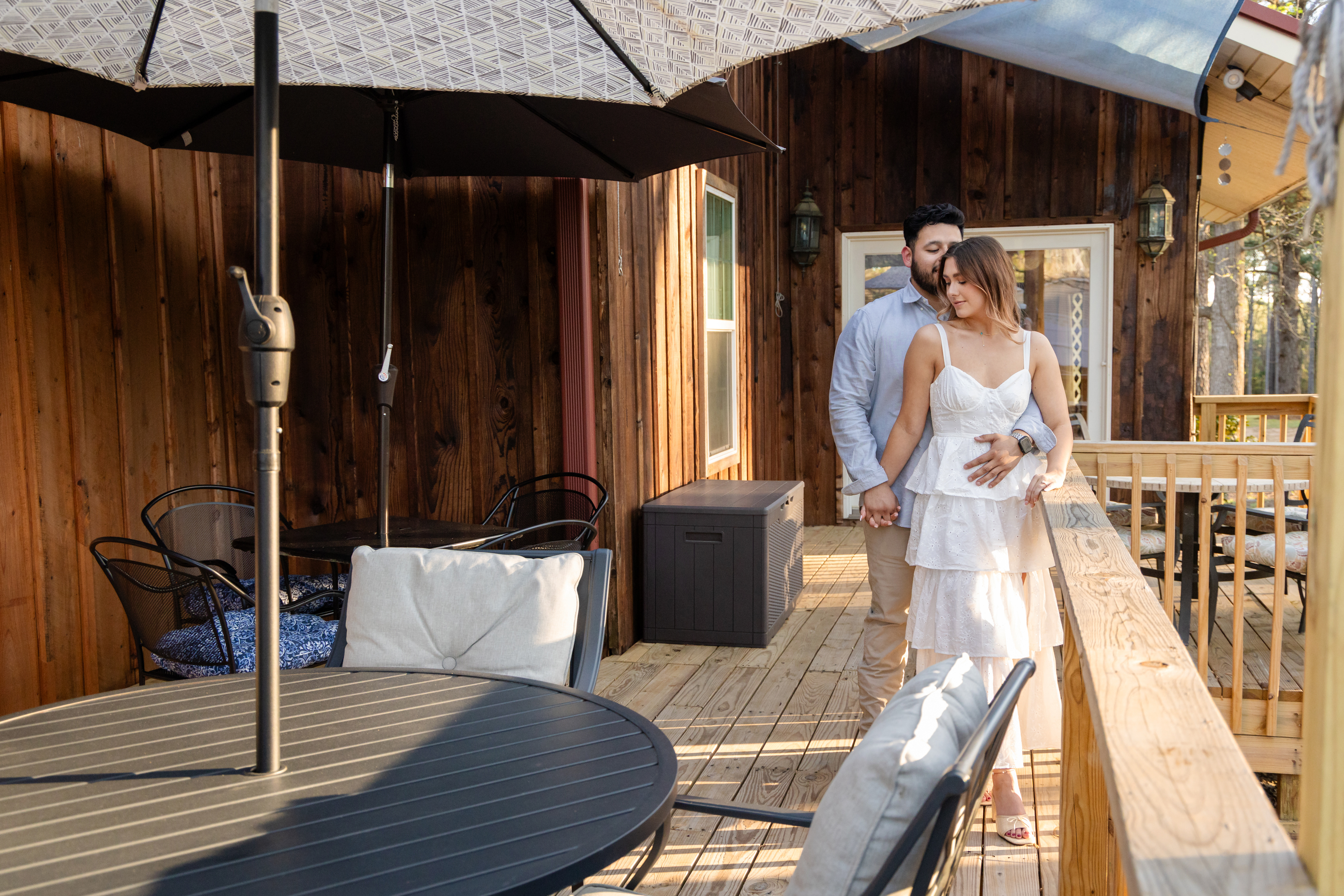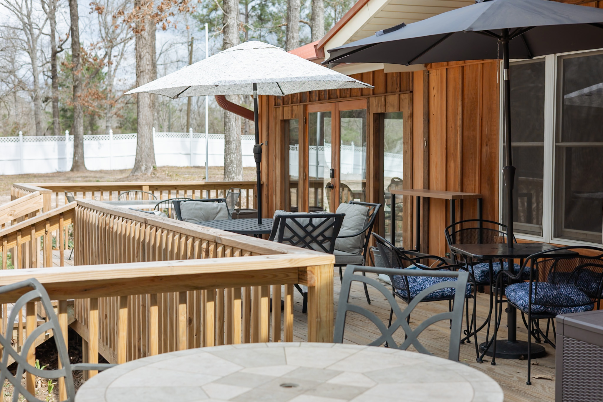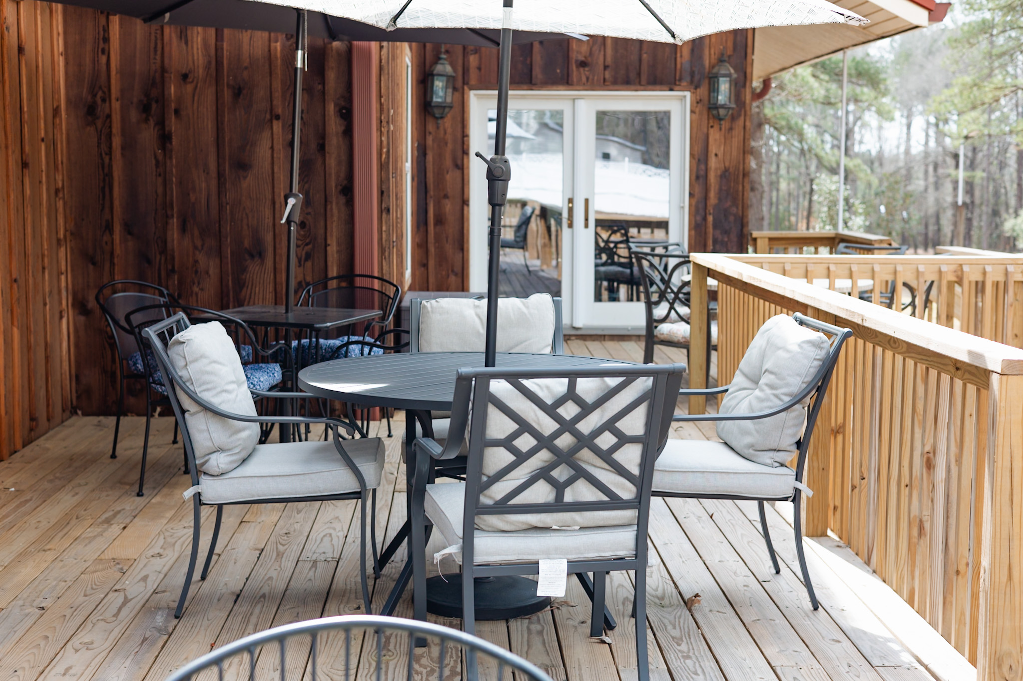 Guests naturally move between the gathering hall, decks, patio, and fire pit. These spaces encourage relaxed conversation and shared moments throughout the celebration.